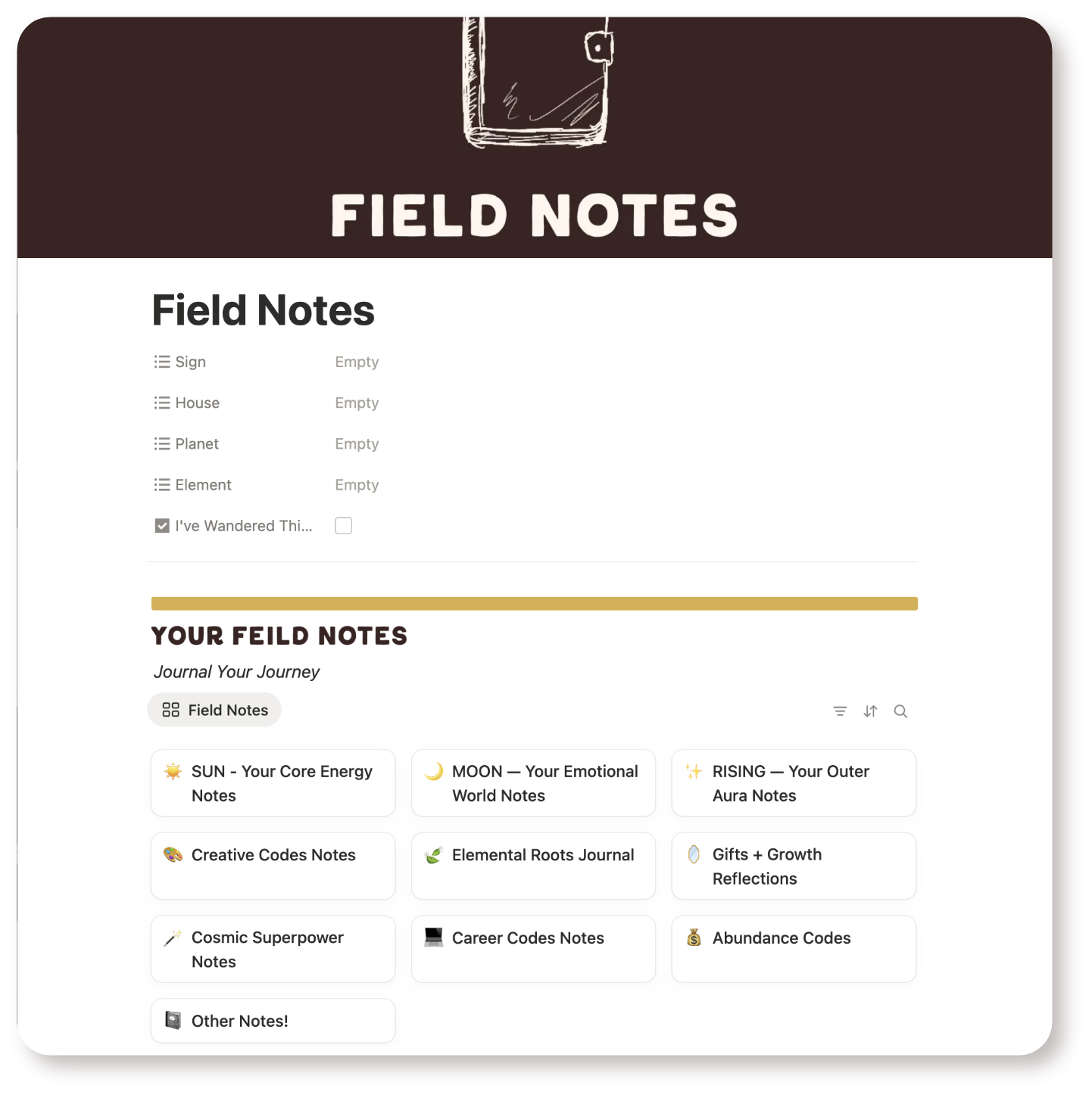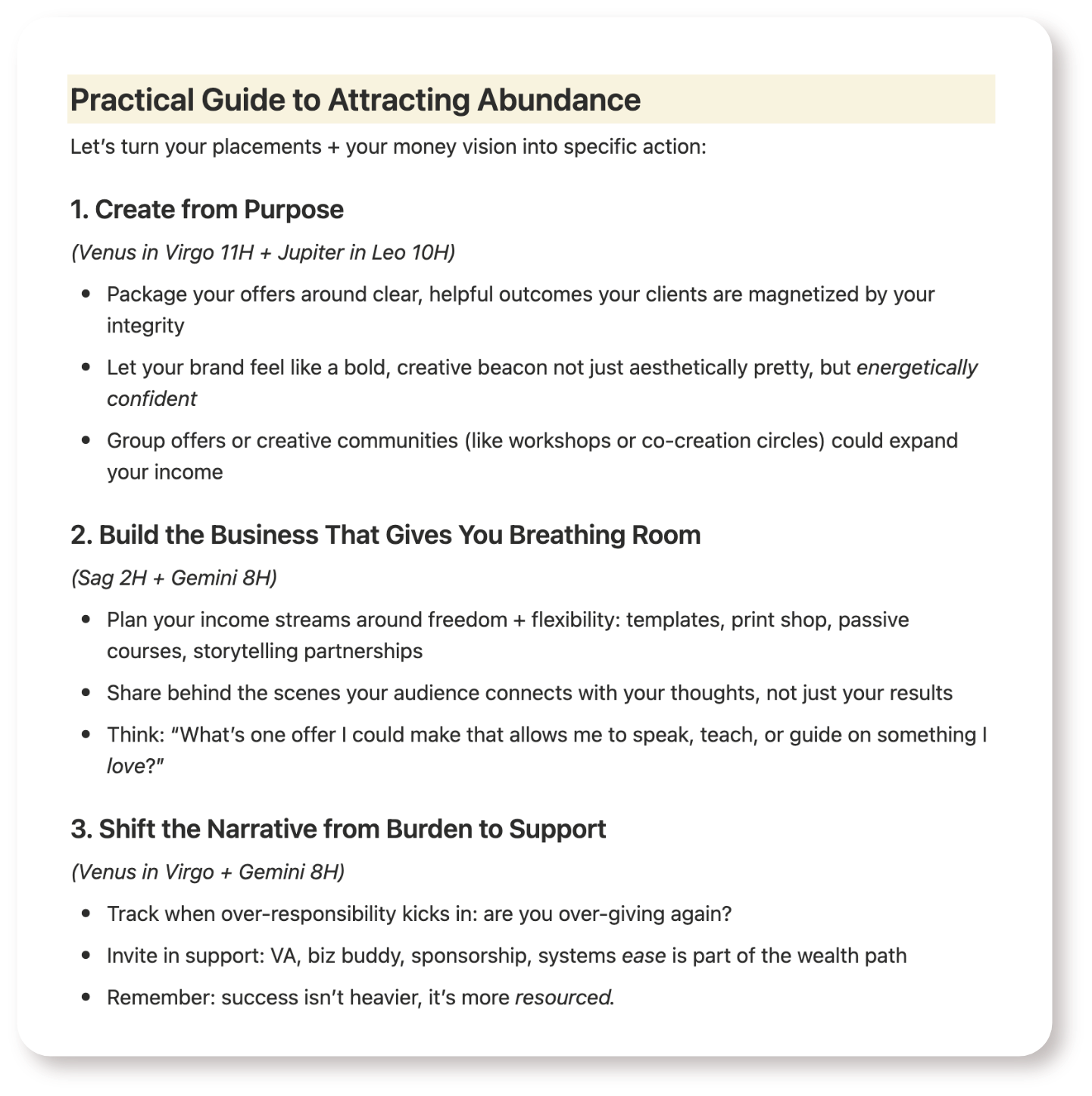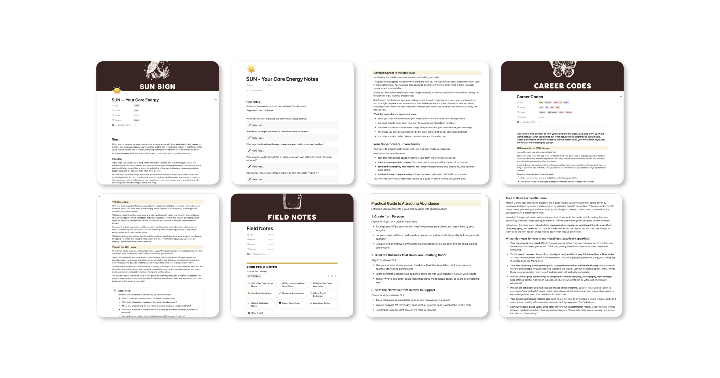 Your personalized Field Guide doesn’t just tell you what your chart placements mean — it shows you how they come alive in your business, creativity, and everyday life. Think of it as a map you’ll return to again and again, with practical insights, reflection prompts, and space to make it your own.